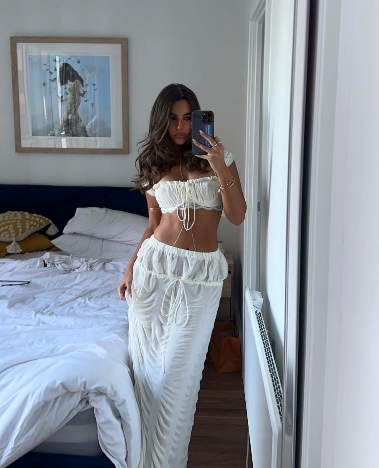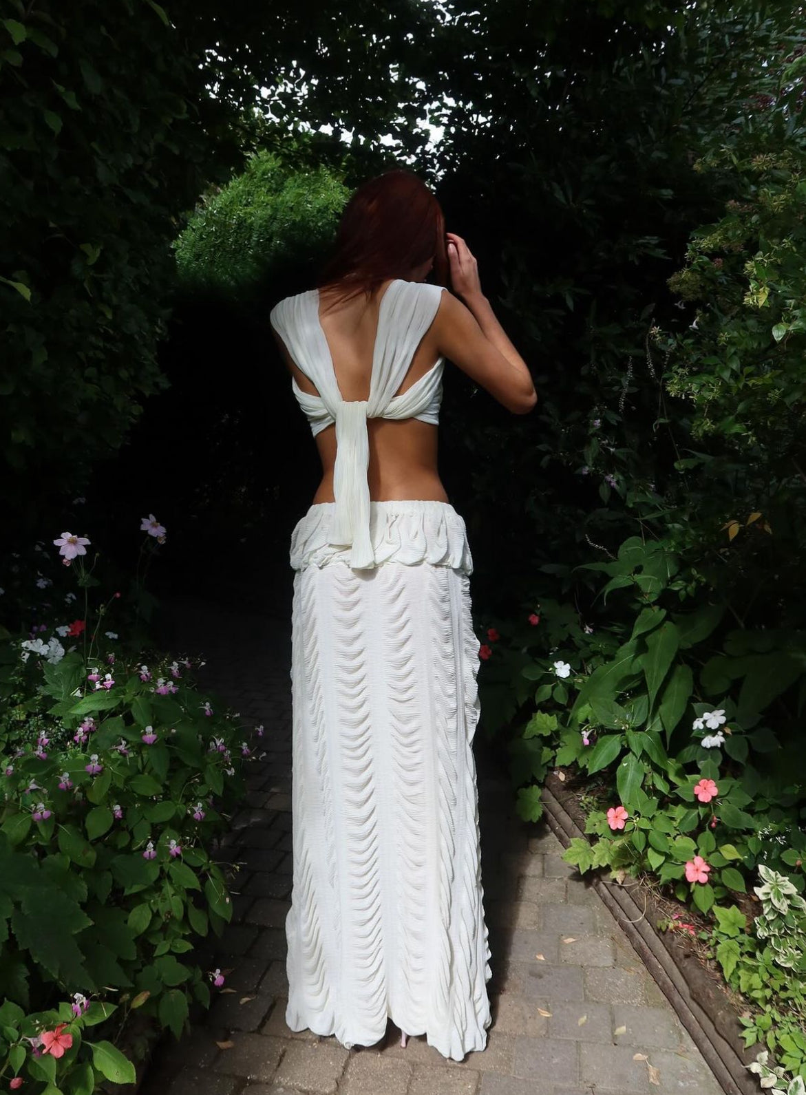 Features a semi sheer stretch crepe top and skirt in ivory. The skirt is fully lined with soft ivory mesh